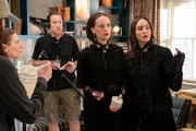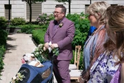 Howard pushes Winnie in her dog stroller down the aisle. Next, Oliver comes in with Charles and Mabel on either side of him. They look at the end of the aisle and Oliver starts to worry something has happened. Uma screams, startling everyone, but then says she just thought she saw a roach. Finally, Loretta appears, escorted by Dickie and Will. When they get to the end of the aisle, Will says they lost track of time. Dickie adds that they had a lot of catching up to do. They start the ceremony. After it's all done, they walk back down the aisle.